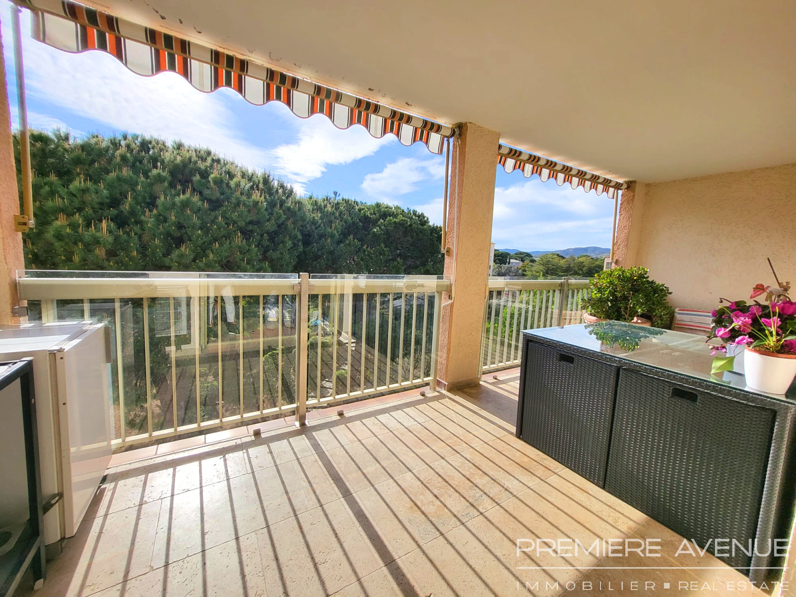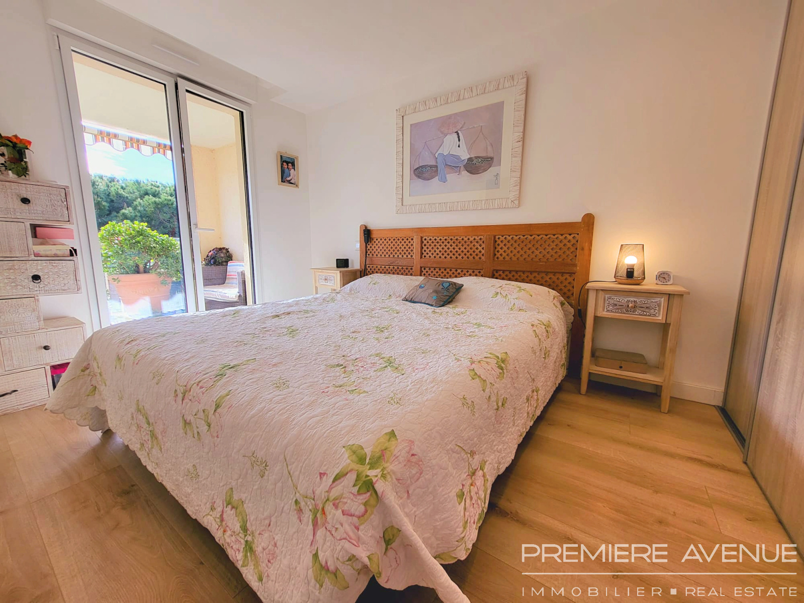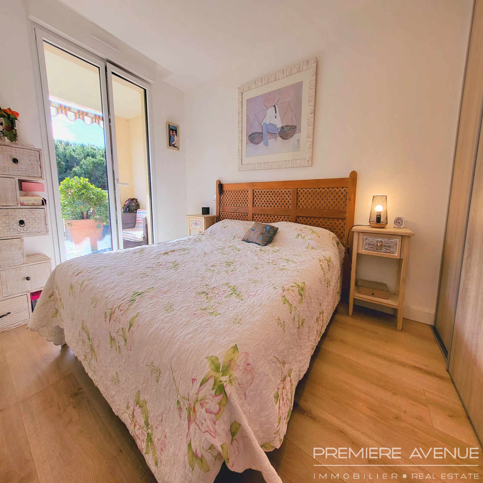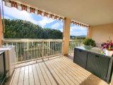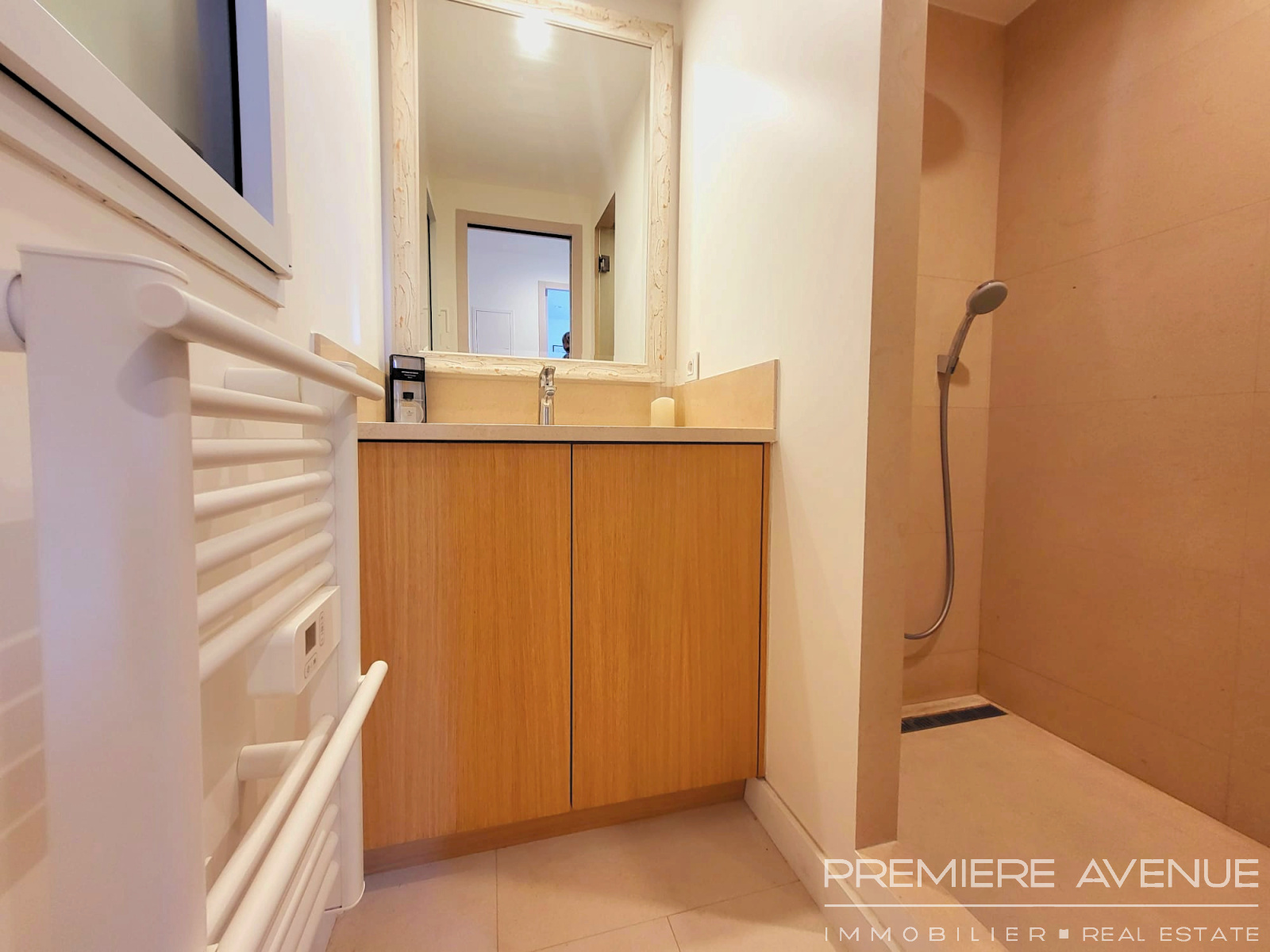 Les finitions sont très soignées, la terrasse exposée Ouest avec belle vue sur la verdure mesure 13 m², elle est couverte et le sol en travertin.