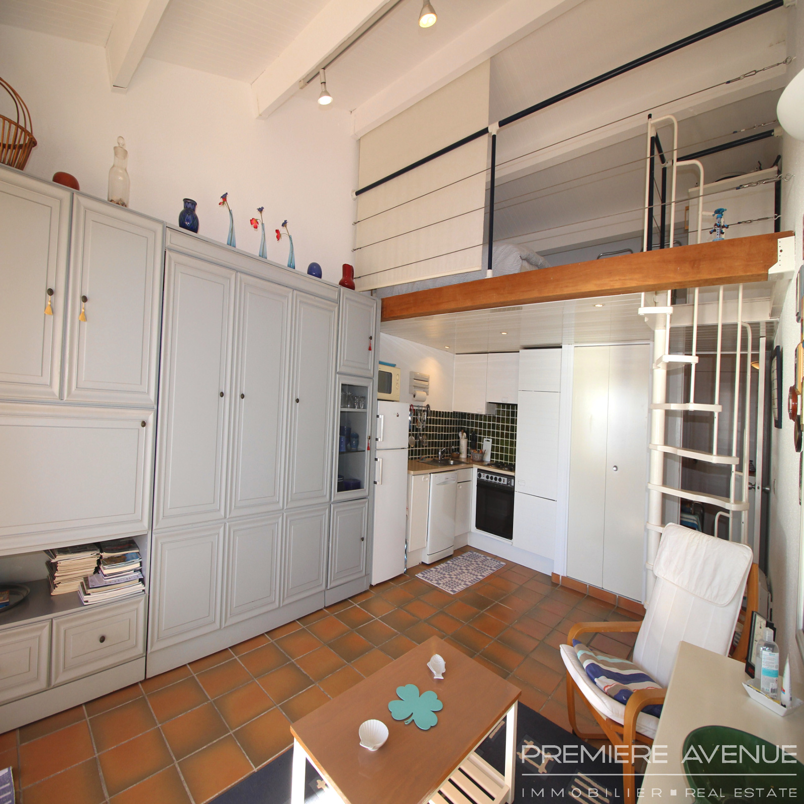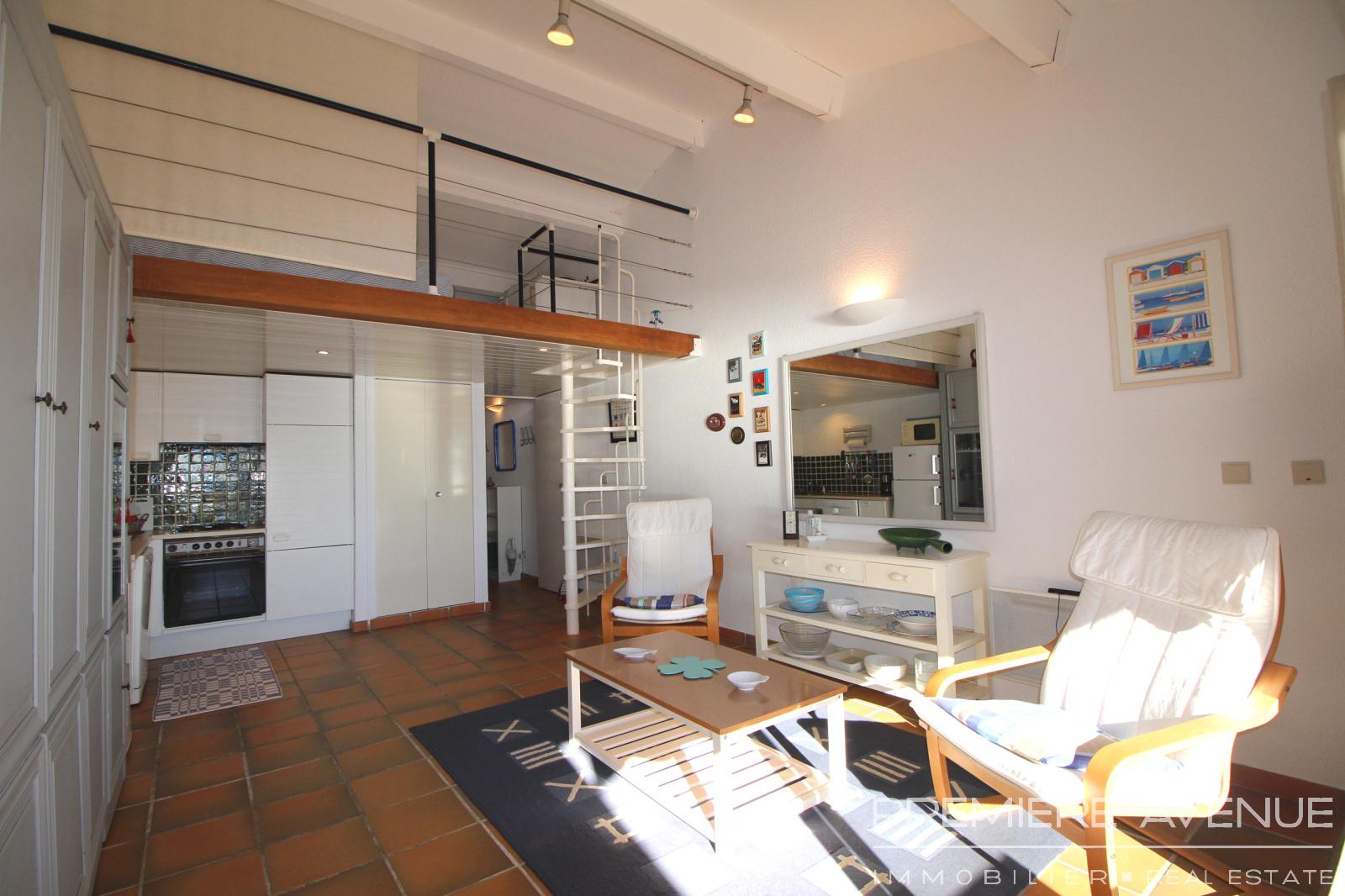 Il est composé d'un séjour avec cuisine américaine donnant sur une large terrasse, un coin nuit en mezzanine, une salle de bain et un WC séparé.
