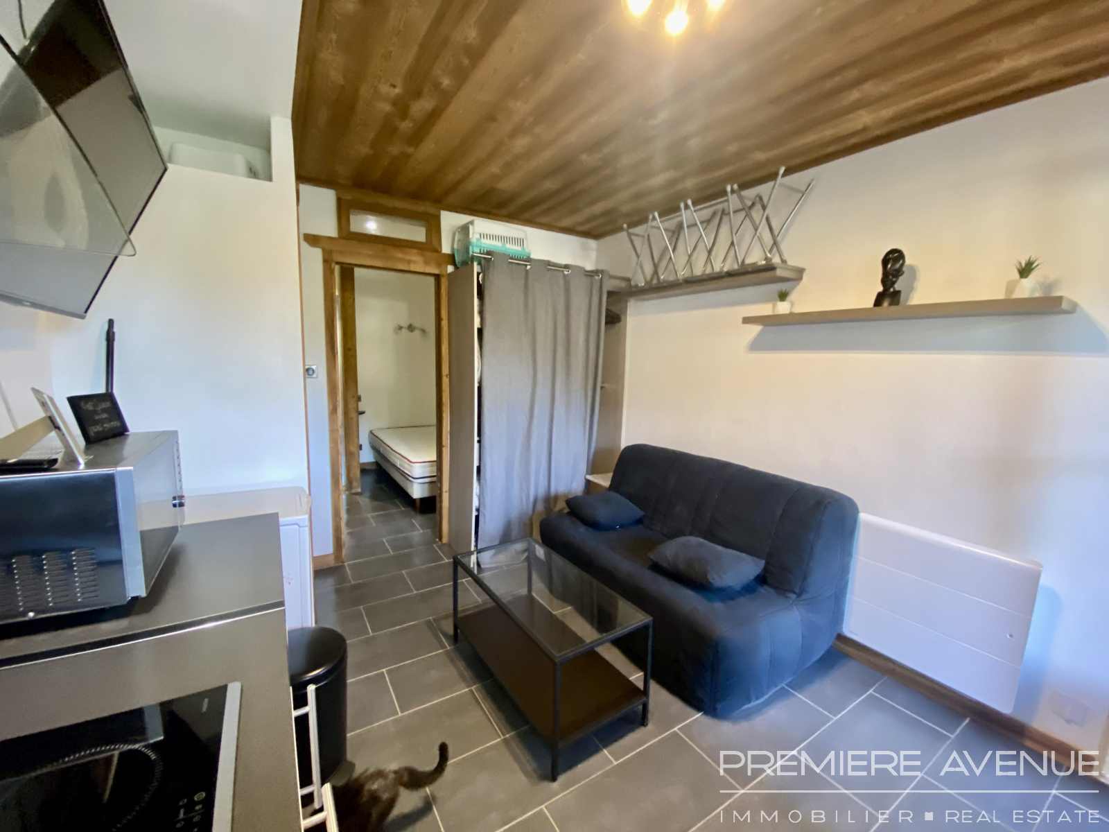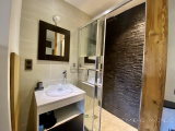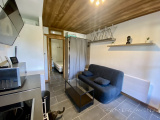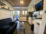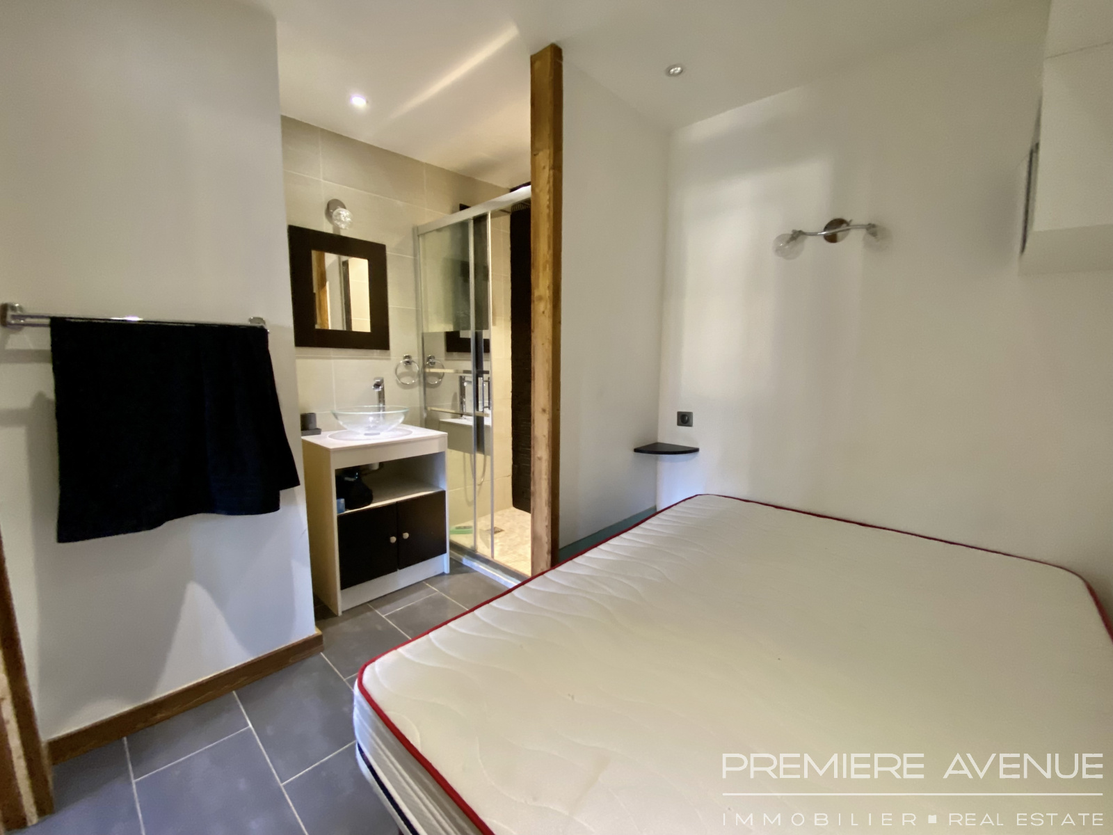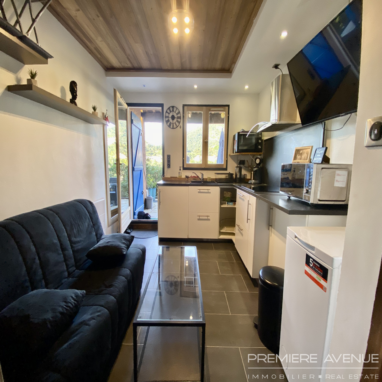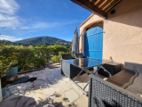 Pièce à vivre avec cuisine ouverte équipée donnant accès à une belle terrasse couverte face aux collines, wc indépendants, chambre avec salle d'eau.